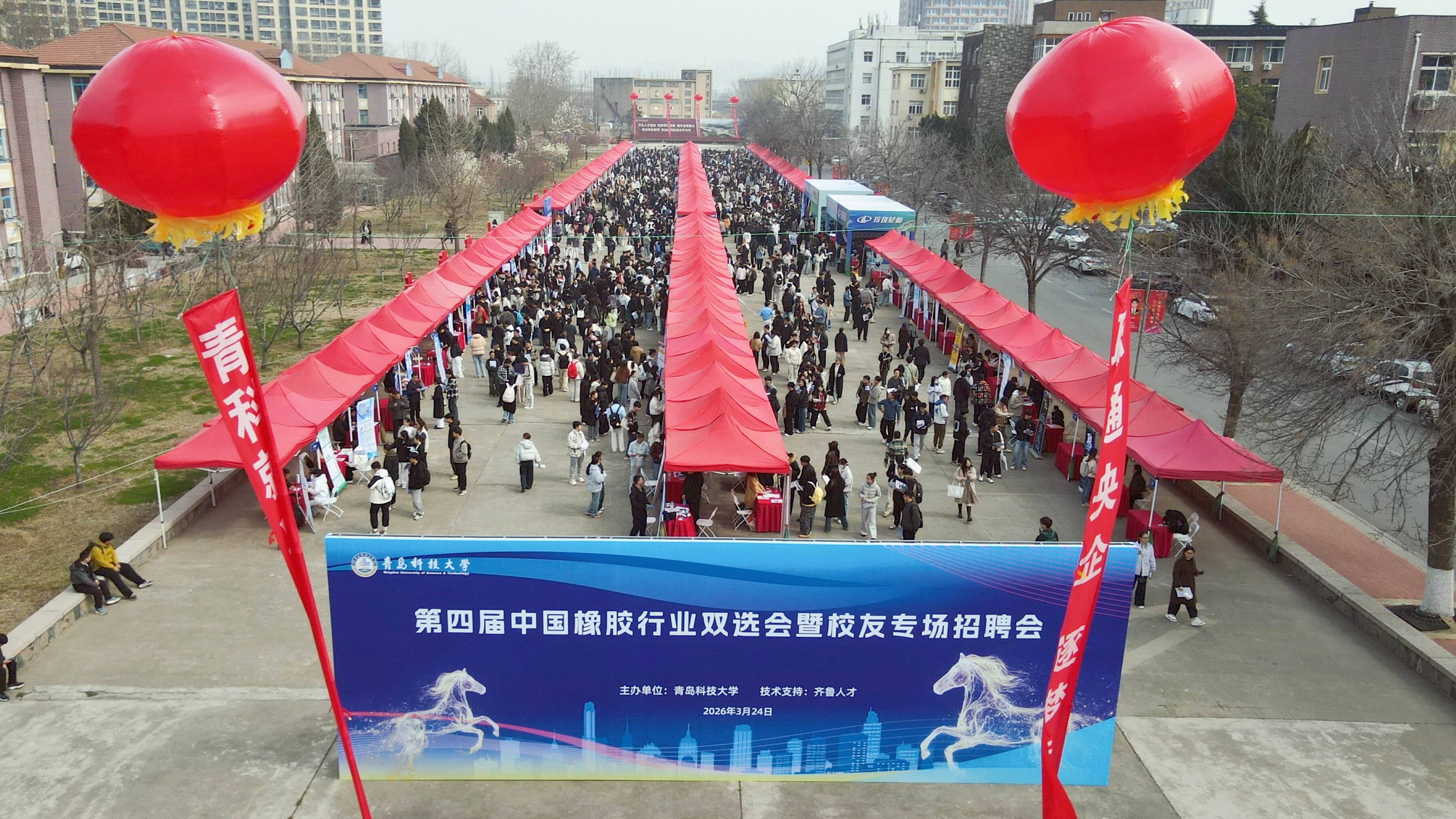 3月24日,一场充满“同窗情”的招聘会在四方校区小五四广场举行,第四届中国橡胶行业双选会暨校友专场招聘会火热开启。学校党委常委、副校长王震深入现场调研指导,了解企业招聘需求与学生求职动态。各学院(校区)、相关职能部门负责人及一线教师、辅导员走进现场,向用人单位精准推介优秀学子。