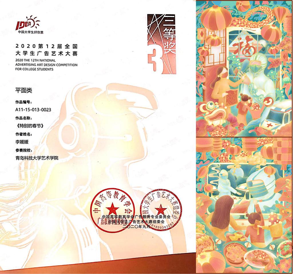 日前,第十二届全国大学生广告艺术大赛学科竞赛成果展示暨颁奖典礼在北京圆满落幕,青科大艺术学院学生在大赛涉及的平面、动画、短视频、策划案等8个参赛类别评选中取得优异成绩,获得国家级二等奖1项、三等奖1项、优秀奖2项。此外,在山东省赛区作品评选中获得省级一等奖1项、二等奖1项、三等奖5项、优秀奖30项,学生累计获奖超40项,创该项赛事学院参与以来的最好成绩。由本科视传171班学生陈国强创作、视传系教师盛洁指导的平面作品《天使的承诺》获国赛二等奖,研究生2019级艺术设计专业学生李媛媛创作、视传系教师王虹指导的平面作品《特别的春节》获国赛三等奖。