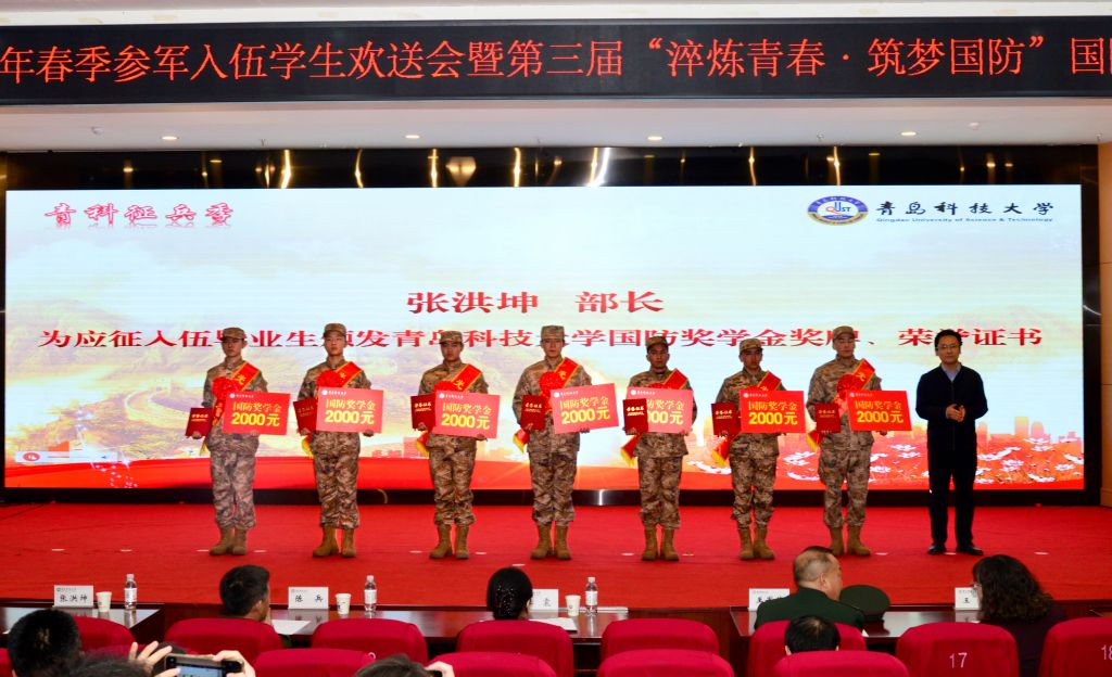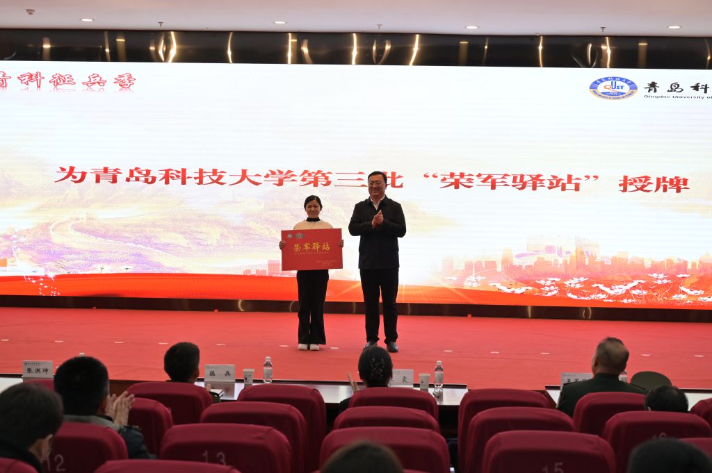 王军伟寄语新入伍学生扎根军营强军报国。张洪坤为应征入伍毕业生颁发青岛科技大学国防奖学金奖牌和荣誉证书。学校党委学生工作部(武装部)部长王丽宣读了《青岛科技大学2026年春季市北区应征入伍大学生士兵名单》,并为首届“优秀母校指导员”颁发荣誉证书。后勤管理处处长匡荣富为“荣军驿站”窗口颁发牌匾。