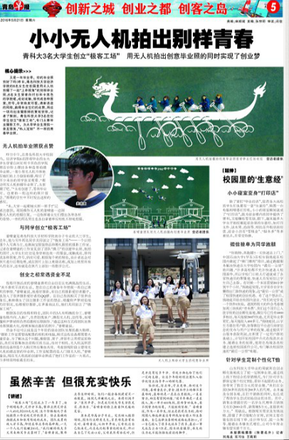 头版:青科大3名大学生创立“极客工场” 用无人机拍出创意毕业照的同时实现了创业梦
