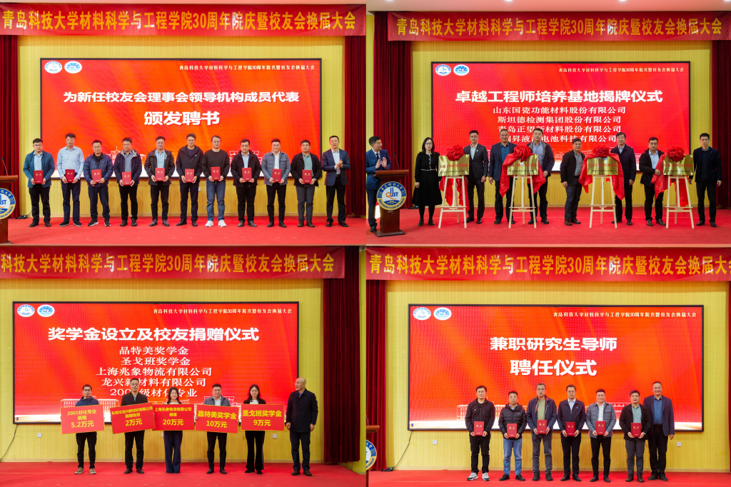 活动中,聂广明宣读了《关于同意青岛科技大学材料科学与工程学院校友会换届的批复》,并为新任校友会理事会领导机构成员代表颁发聘书。材料学院党委书记孟照国汇报了校友会换届大会筹备情况。材料学院李桂村介绍了学院近年来在学科建设、师资队伍、科学研究等方面的发展情况。2007届校友、江苏国瓷新材料科技股份有限公司总经理孙玄玄作为校友代表发言。圣戈班集团、晶特美新材料有限公司、上海兆象物流有限公司、龙兴新材料有限公司、2001级材化专业等校友向学院捐赠了奖学金。学院与斯坦德集团、国瓷材料、正望新材料、瑞昇液流电池等多家行业领军企业共建的“卓越工程师培养基地”正式揭牌。学院兼职研究生导师聘任仪式同期举行。