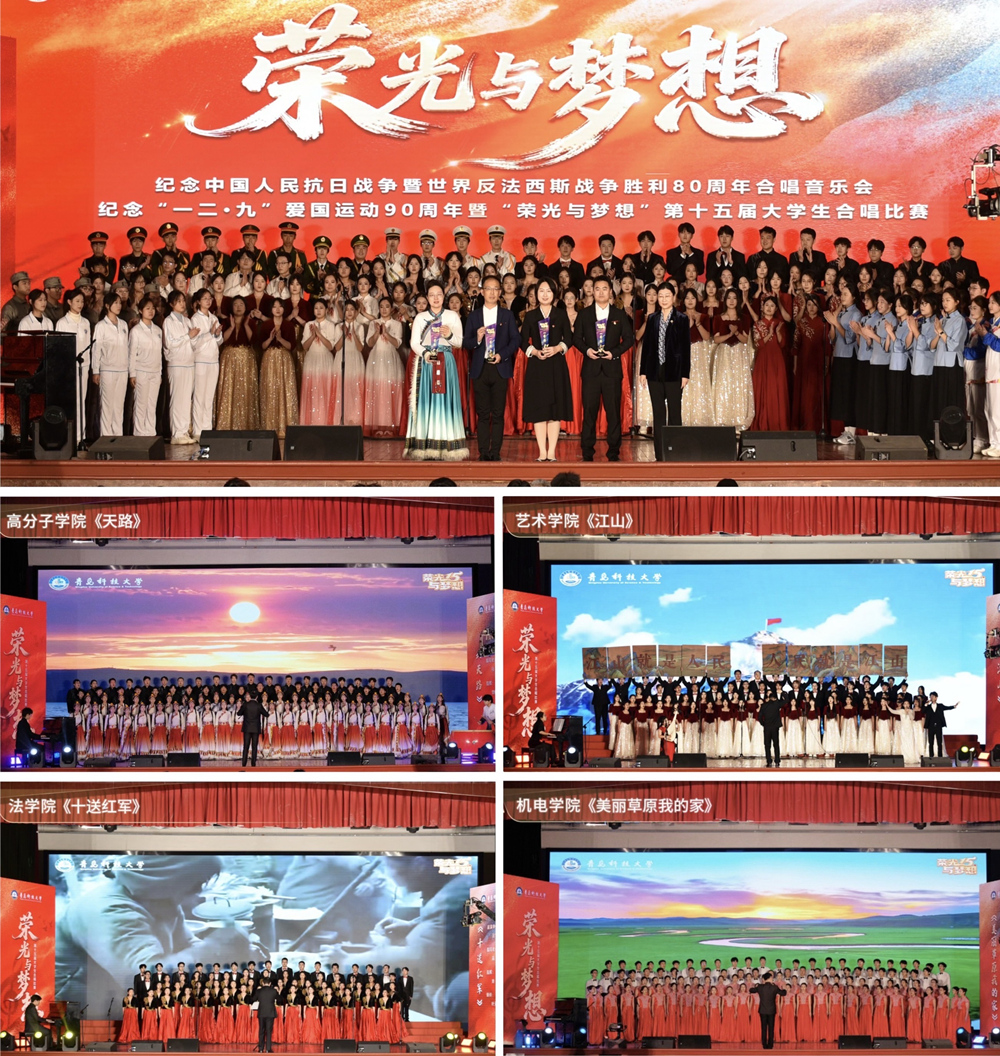 为纪念中国人民抗日战争暨世界反法西斯战争胜利80周年、“一二·九”爱国运动90周年,激励青年学子传承红色基因、坚定理想信念,12月9日,学校纪念中国人民抗日战争暨世界反法西斯战争胜利80周年合唱音乐会、纪念“一二·九”爱国运动90周年暨“荣光与梦想”第十五届大学生合唱比赛在四方校区西礼堂举办。学校党委领导班子成员沈文青、丁林、王震、张洪坤、秦姣出席活动。