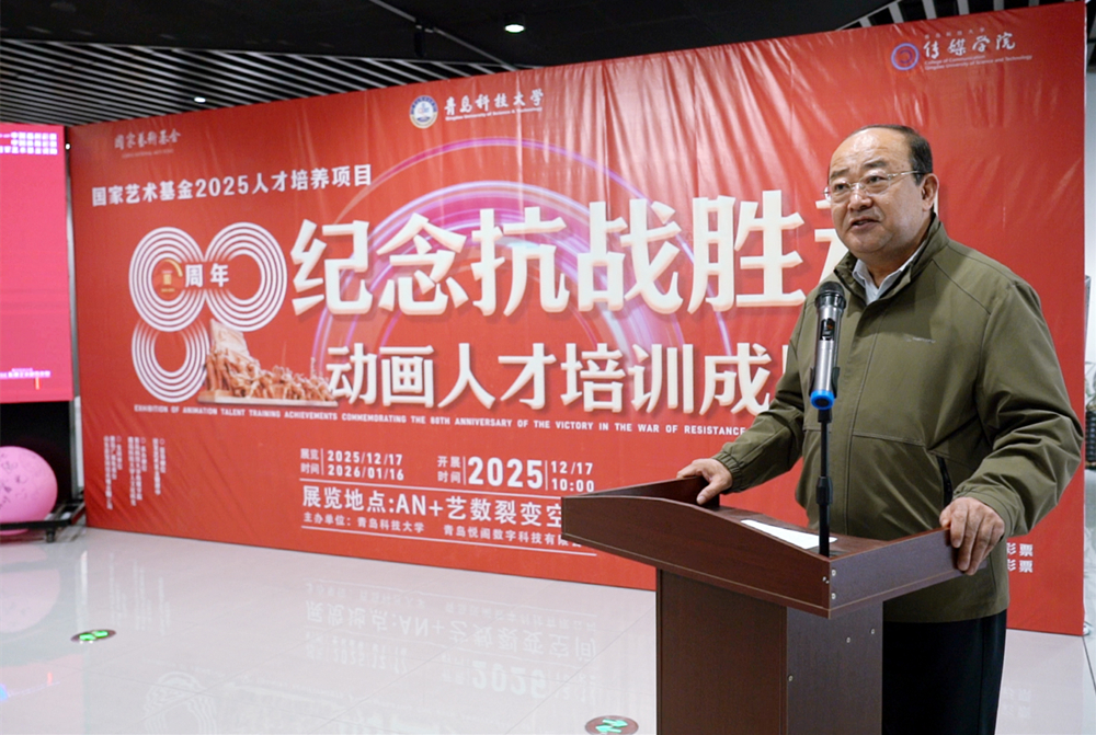 12月17日,由国家艺术基金资助、青岛科技大学主办的国家艺术基金2025年度艺术人才培养资助项目——“纪念抗战胜利80周年主题动画人才培训项目”成果展在青岛信联天地隆重开幕。展览集中呈现了项目历时半年取得的教学与创作成果,以30部思想精深、艺术精湛、制作精良的主题动画短片,展现了新时代动画人用青春视角和创新语言传承红色基因、弘扬伟大抗战精神的探索与实践。党委副书记李勇,党委常委、宣传部部长张洪坤等出席开幕式。