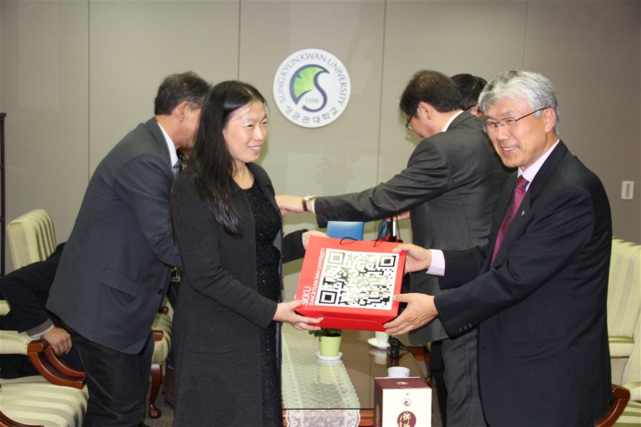 艺术学院党总支书记孙佩珊与成均馆大学副校长宋寅万互赠纪念品