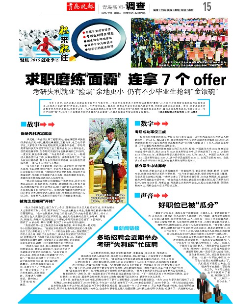 “我之前在就业市场上也接触过一些研究生,其中有咱青岛这边的,也有济南的、天津的,感觉他们找工作也不容易,我觉得提升自己有各种方式,除了读研也有其他选择。 ”在反复权衡了自己的条件后,李培民觉得跟本科同学竞争自己更有优势,他决定进入就业市场,看看能否遇到自己心仪工作。去年秋天,李培民开始拉开自己的就业季大幕。“我大三在烟台富士康工作了2个月,暑期还去市北区人社局实习过,后来在顺丰人力资源部工作2个月,刚开始找工作就决定跳出本专业,选择自己更感兴趣的项目管理职位。 ”在李培民看来,毕业之后再去找工作决定自己喜欢什么,成本太高,因为在大学期间尝试过不同行业,就业时他选择的范围大为缩减。管理类、销售类、房地产类,瞄准这三个领域,李培民前前后后投了15份简历,面试了10家公司,最终“面霸”拿到了7家公司的用人通知。“我面试的第一份工作是优衣库的储备店长,却不幸在第一轮无领导小组面试就被Pass。 ”在就业市场里沉浮,李培民说他的心情也如经历了过山车般的上上下下。 “一开始没有拿到offer,我就想找工作怎么这么难,但自己也会劝自己,说毕业季就是找工作的时间,总要再试试。 ”不同于别人面试就是为了拿offer,李培民却很享受应聘的感觉,他觉得无论面试官提问,还是跟其他竞争者交流,都是一次开拓眼界提升自己的机会。
