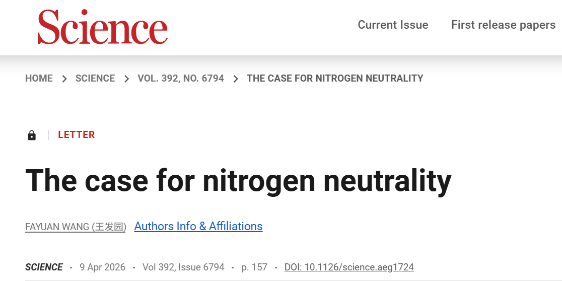近日,环境与安全工程学院王发园教授在Science期刊Letter专栏发表题为“The case for nitrogen neutrality”(氮中和的必要性)的论文(https://www.science.org/doi/10.1126/science.aeg1724)。