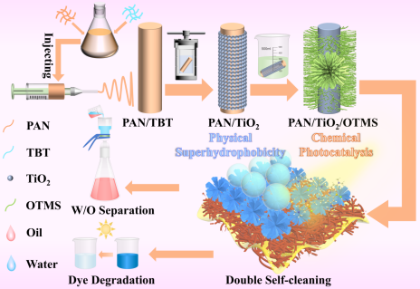 此外,课题组针对油包水乳液分离过程中易发生界面污染的问题,进一步构建了兼具物理与化学自清洁功能的超疏水光催化纳米纤维膜。本部分研究利用静电纺丝结合原位生长技术,在PAN纳米纤维膜表面协同构筑TiO2纳米颗粒与十八烷基三甲氧基硅烷(OTMS),形成具有微米级花簇和纳米突起分级结构的复合界面,使纳米纤维膜兼具优异的超疏水性能(水接触角>154°,滑动角<5°)和光催化活性。经系统优化后的纳米纤维膜,表现出优异的油包水乳液分离性能(2388 L·m-2·h-1的高油通量和99.9%的水分离效率),并可在150 min内实现约99%的亚甲基蓝降解和自清洁性能。循环实验表明,通过超疏水物理自清洁与光催化化学自清洁的协同作用,纳米纤维膜在多次运行后仍保持超过83%的油通量恢复率和低于17%的不可逆污染率,展现出优异的抗污染性能与运行稳定性。相关研究成果以《Self-cleaning nanofiber membrane for efficient oil-water separation and dye degradation》为题发表于国际期刊《Journal of Cleaner Production》(中科院一区,IF=10.0),论文第一作者为生物工程学院硕士研究生白海潮,青岛科技大学为第一单位,通讯作者为孟祥民副教授。