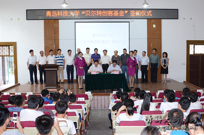 仪式上,副校长韦殿华、校友朱国有还分别代表青岛科技大学、无锡市贝尔特胶带有限公司共同签署了《青岛科技大学“贝尔特创客基金”项目协议书》。“贝尔特创客基金”的初始来源由朱国有校友出资100万元人民币设立,主要用于资助在江浙沪鲁地区自主创业的青岛科技大学优秀校友和学生。