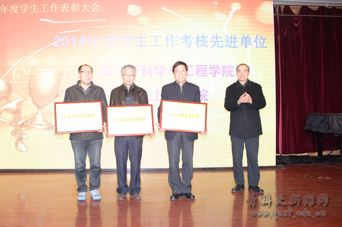 大会表彰了获得各项荣誉的集体和个人。高分子学院、职业技术学院、化工学院获得“2014年度学生工作先进集体”荣誉称号,材料学院、高分子学院、化工学院、机电学院、职业技术学院荣获“毕业生就业工作先进奖”,并被授予“青岛科技大学2014届毕业生就业工作先进单位”荣誉称号。会上还对学生工作进步奖、学风建设单项奖、宿舍建设单项奖、科技文体活动单项奖、就业工作优秀奖、就业工作进步奖、就业工作达标奖等单项奖进行了表彰,并对第一届十佳班主任、优秀辅导员、校级先进班集体、优秀学生干部、优秀学生等集体和个人进行了表彰。